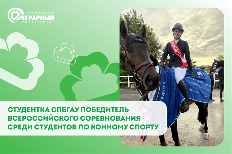Новые спортивные вершины покоряются студентами Санкт-Петербургского государственного аграрного университета. Александра Рыженкова, студентка Института животноводства и аквакультуры имени В.И. Наумова, одержала триумфальную победу, став абсолютным чемпионом Всероссийского соревнования среди студентов по конному спорту. Состязания проходили в Московской области.