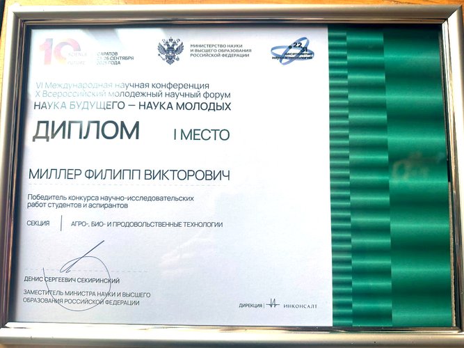 Магистрант Алтайского ГАУ Филипп Миллер стал победителем X Всероссийского молодежного научного форума «Наука будущего - наука молодых» в Саратове