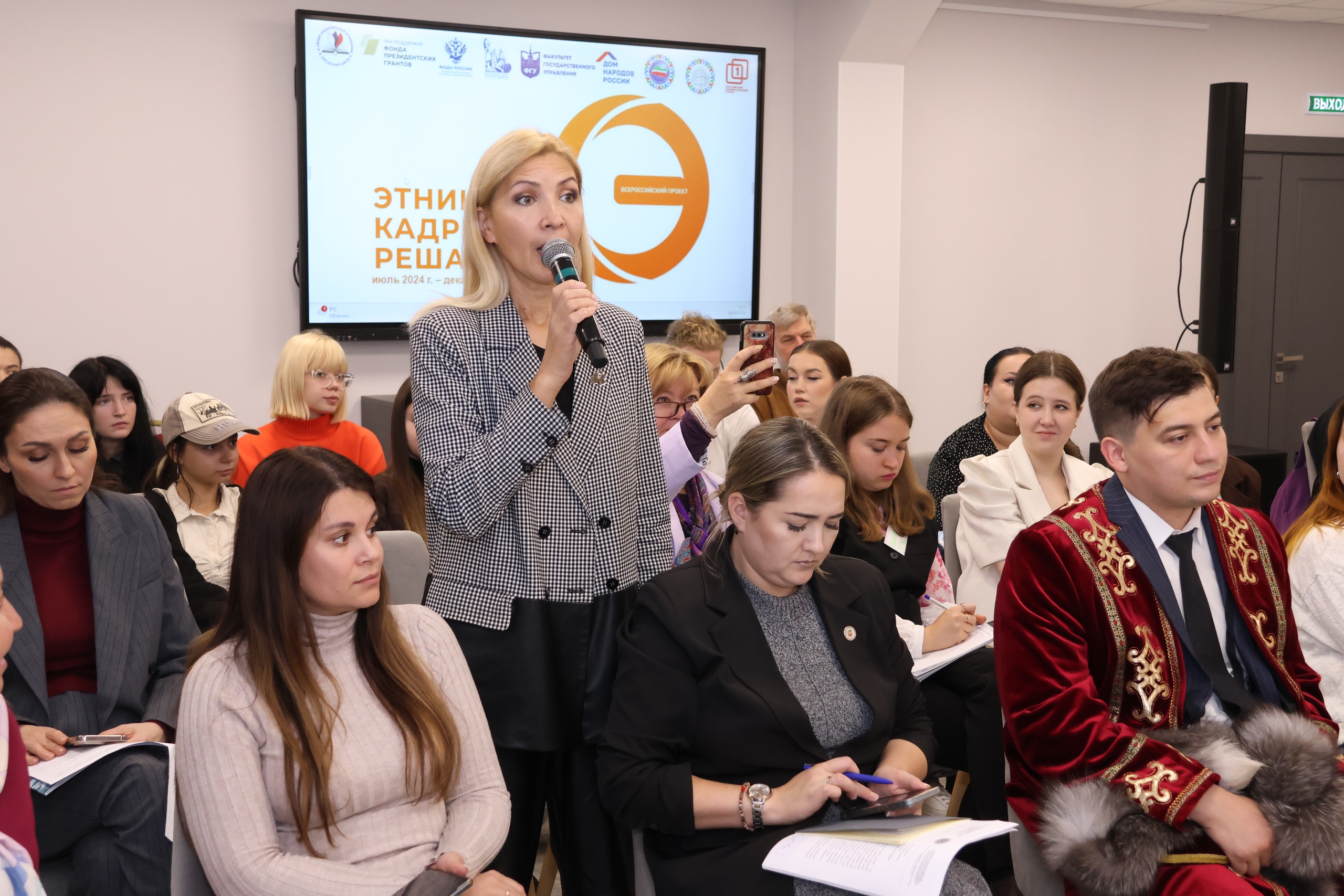 О проблемах и путях решения кадрового вопроса этнокультурного сектора на круглом столе говорили директор Ресурсного центра, модератор круглого стола Евгения Михалева и доцент кафедры управления в сфере межэтнических и межконфессиональных отношений факультета государственного управления МГУ имени М.В. Ломоносова Варвара Сажина.