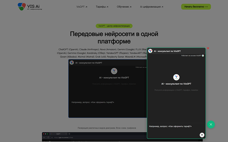Платформа VisGPT https://ai.vis.center объединяет свыше 50 нейросетей, включая ChatGPT, DeepSeek, Claude, Gemini, Qwen, российские решения GigaChat, YandexGPT, собственную модель VisGPT и многие другие. Пользователи получают доступ к сервису после простой регистрации; оплата осуществляется в рублях через личный кабинет.