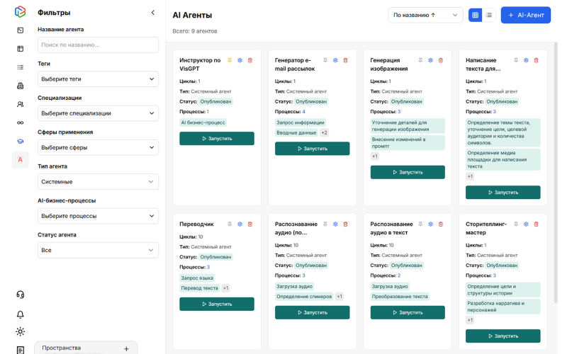 Платформа VisGPT предоставляет визуальный инструмент для создания AI-агентов. Каждый агент настраивается из последовательности пользовательских этапов, где для каждого шага можно выбрать одну из доступных нейросетей, добавить инструкции и загрузить необходимые файлы. Для популярных бизнес-задач предлагаются готовые шаблоны агентов, например, для перевода текстов или работы с отчетами.