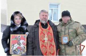 Отец Владимир отслужил молебен о здравии и спасении российского воинства. После богослужения священник благословил росгвардейцев на ратную службу, окропив святой водой.