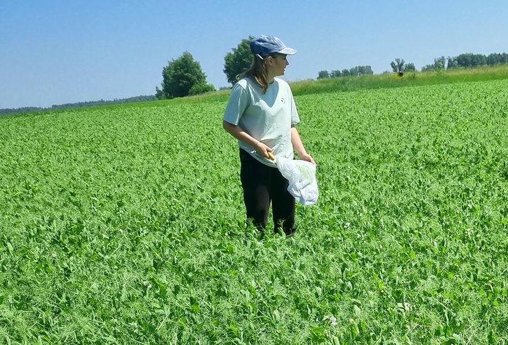 Студентка 3 курса Агрономического факультета Алтайского ГАУ Арина Клинцова в производственных посевах на полях ИП «Нелюбов А.А.» в Троицком районе Алтайского края проводит исследование на тему «Оценка действия биологического препарата “Азофок” в посевах гороха в условиях Бийско-Чумышской зоны Алтайского края» (научный руководитель: к.с.-х. н., доцент кафедры ботаники, плодоовощеводства и лесного хозяйства Лилия Ступина).