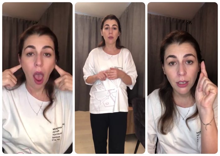 Педагог по сценической речи показала участникам онлайн-лекции ряд важных упражнений, заставляющих работать лёгкие и диафрагму, наладить правильное дыхание, освободить энергию и убрать зажатость.