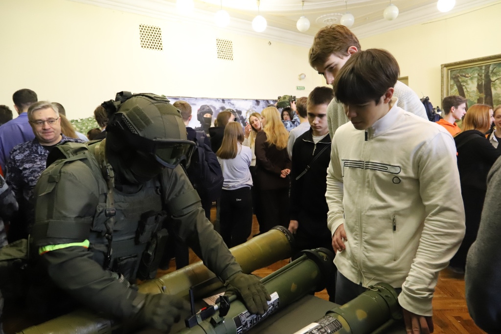 В фойе гарнизонного Дома офицеров была развернута выставка, где гости могли ознакомиться с вооружением и специальными техническими средствами, используемыми в служебной деятельности спецподразделений Росгвардии. Юные участники с интересом примеряли экипировку бойцов, пробовали свои силы в сборке и разборке учебного оружия.