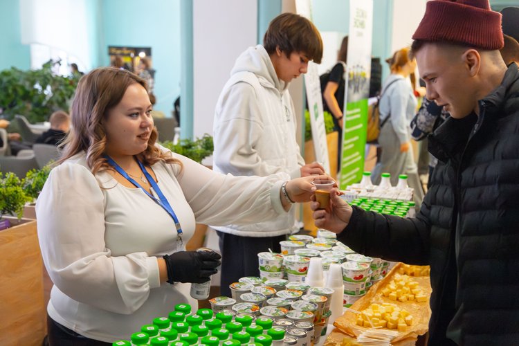 В фойе актового зала работала дегустационная площадка, где каждый мог попробовать образцы продукции «ЭкоНивы»: молоко, кисломолочные продукты, несколько сортов твердого и полутвердого сыра.