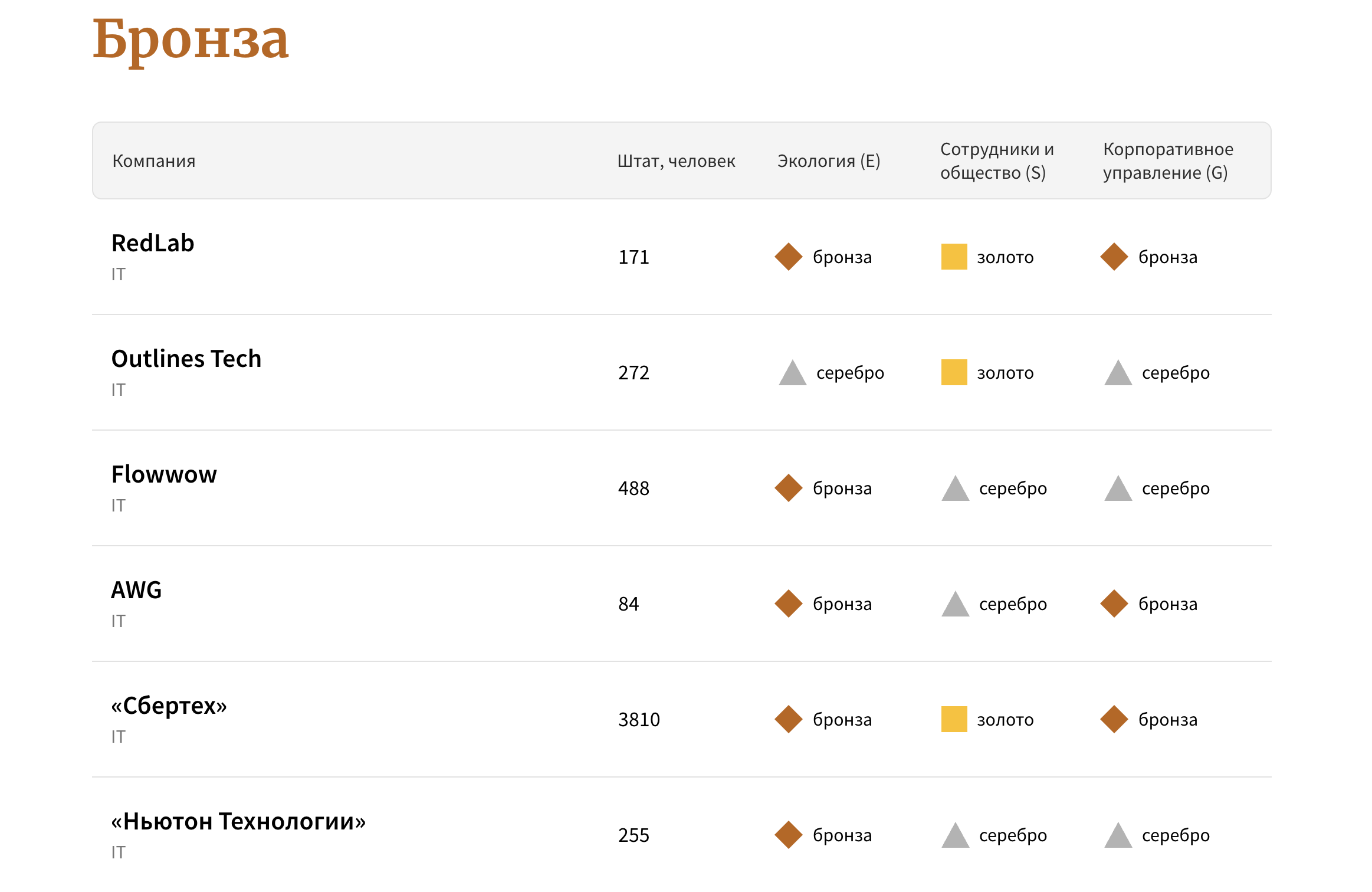 Экспертное жюри подготовило исследование на базе ESG-методики, которая учитывает три блока: «Экология» (E), «Сотрудники и общество» (S) и «Корпоративное управление (G)». В зависимости от набранных баллов участники рейтинга распределялись по четырем группам: «Платина», «Золото», «Серебро» и «Бронза».