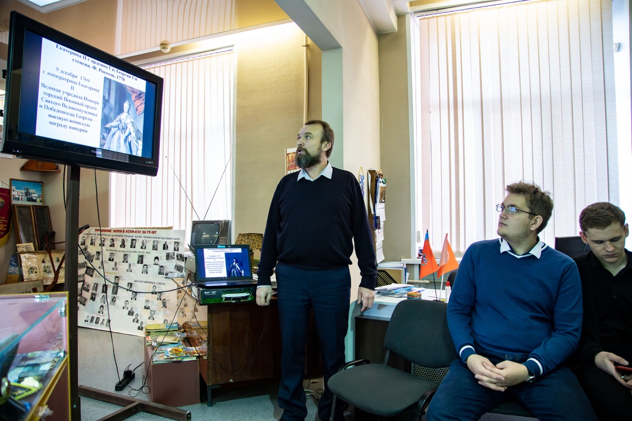 В мероприятии, посвященном Дню Героя Отечества, в Музее истории АСХИ-АГАУ приняли участие студенты первого курса Инженерного факультета. Руководитель музея, к.и.н., доцент кафедры гуманитарных дисциплин Максим Колокольцев подготовил предметы из экспозиции музея и видеоматериалы, рассказывающие об участии преподавателей, сотрудников и выпускников вуза в войнах и локальных конфликтах.