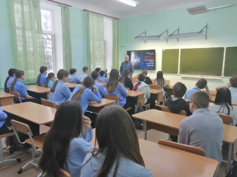 Заместитель начальника Кунгурского отдела вневедомственной охраны Управления Росгвардии по Пермскому краю майор полиции Андрей Серебренников провел профориентационный урок с учениками "Школы с кадетскими классами" №1 г.Кунгур.