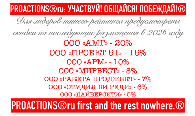 Хотя бы потому, что непременным и обязательным условием попадания в рейтинг было продвижение промоакций, стимулирующих лотерей, публичных конкурсов и рекламных акций возможностями ресурса PROACTIONS.ru.