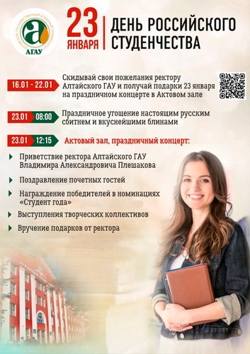 23 января в Алтайском государственном аграрном университете пройдут главные праздничные мероприятия, посвященные Дню российского студенчества.