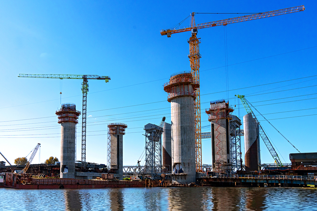 Специалисты ГК Бамтоннельстрой-Мост осуществили монтаж четырех противовесов вертикального подъёма на русловых опорах (№№ 4 и 5) строящегося автодорожного моста через реку Преголю в Калининграде.