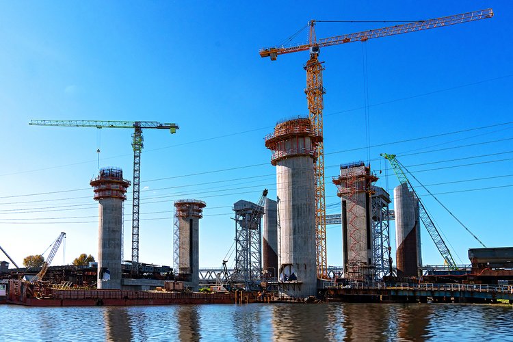 Разводной мост через реку Преголю в Калининграде длиной 386,7 метра – уникальное сооружение. Он станет первым в России автодорожным мостом с вертикально-подъемной системой, размещенной внутри железобетонных башен опор. При разведении будет обеспечен подмостовой судоходный габарит шириной 50 метров и высотой 28 метров.