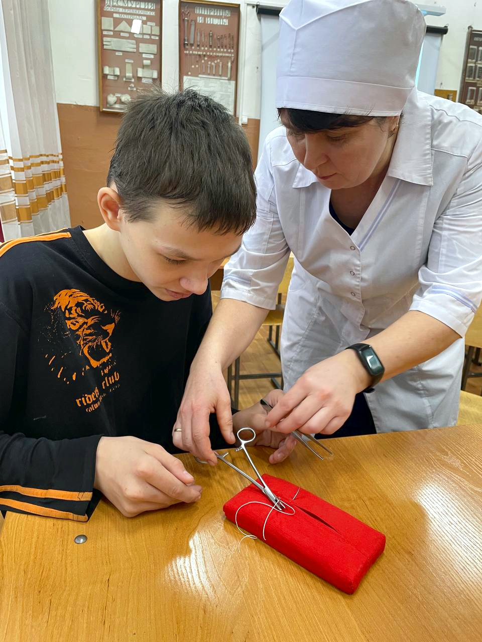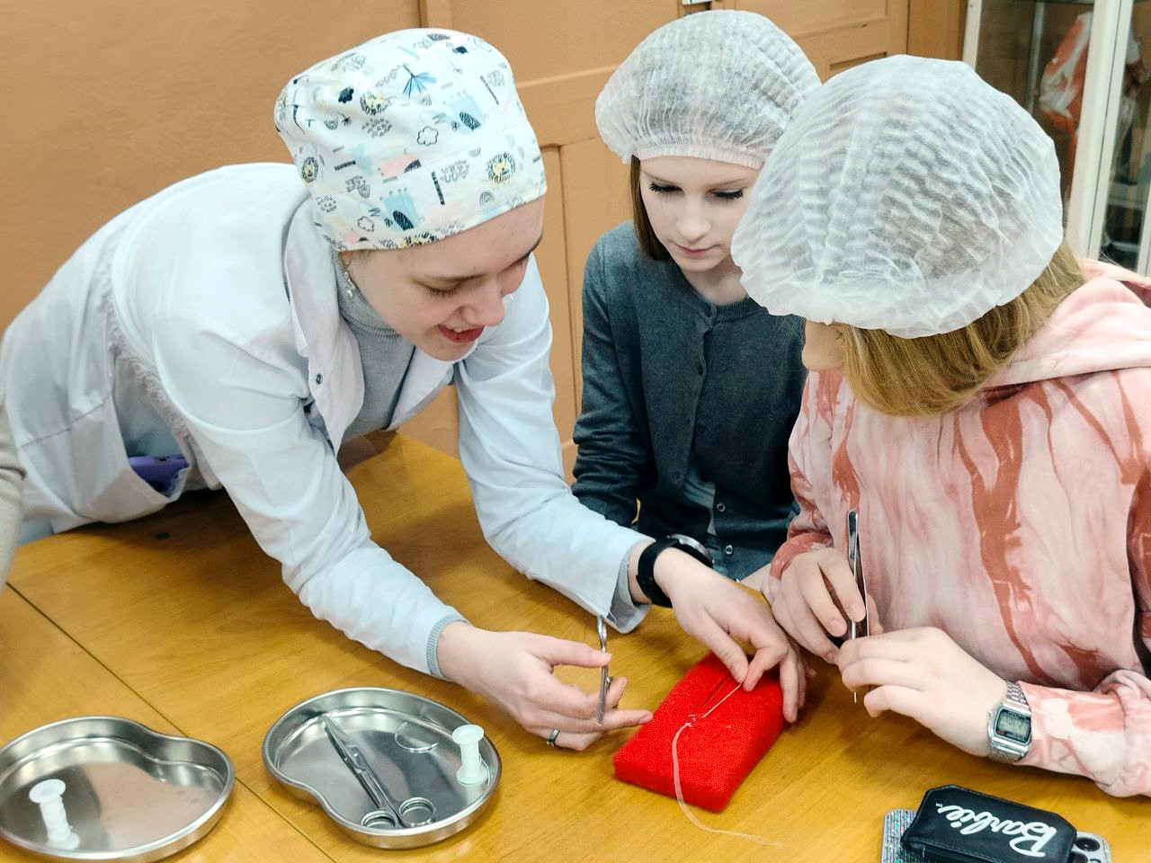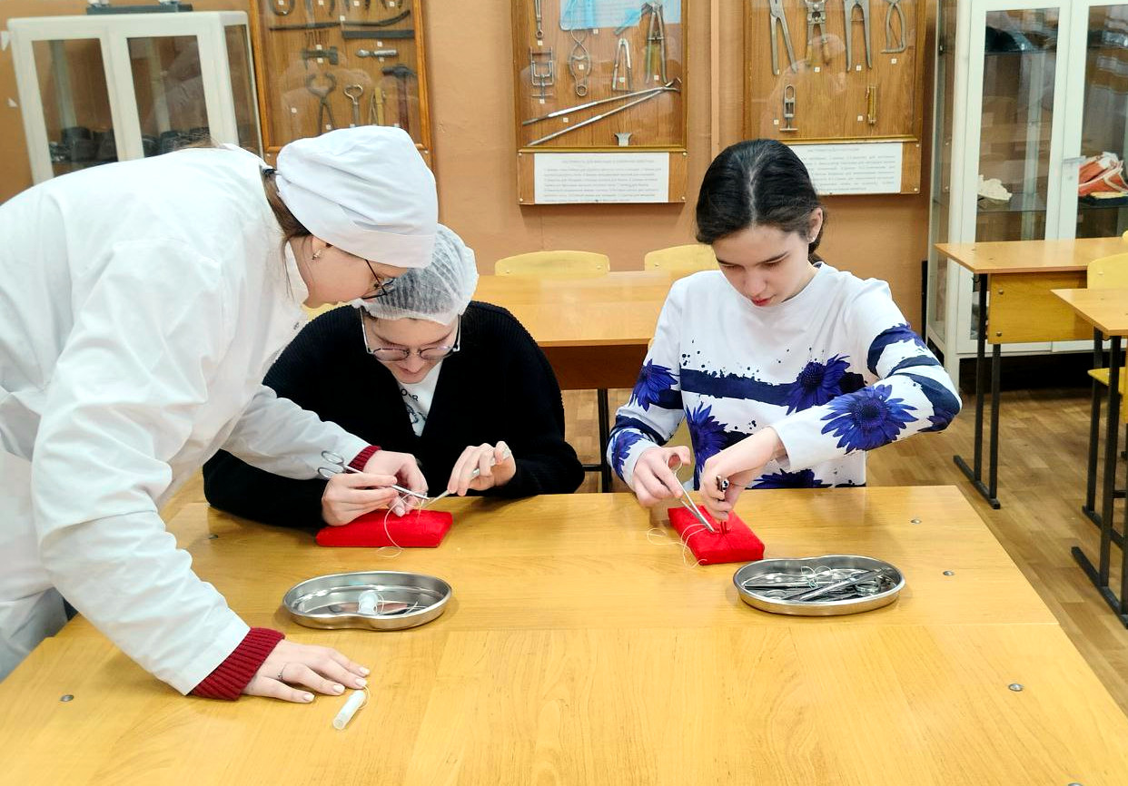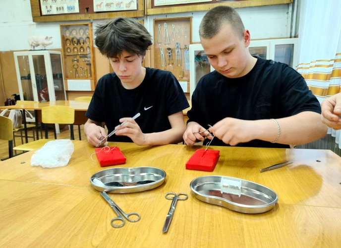 Преподаватели и студенты 4 курса ФВМ АГАУ подготовили для школьников целый ряд мастер-классов, наглядно демонстрирующих уровень современной ветеринарии. Под руководством наставников школьники научились окрашивать бактерии и наблюдать за ними в микроскоп, диагностировать состояние здоровья домашних животных, определять качество яиц птиц и даже освоили основы хирургической техники, научившись накладывать швы.
