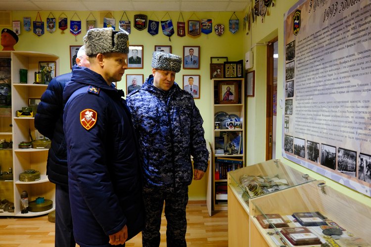 На территории ОМОН «Таир» полковник полиции Роман Макаров посетил комнату боевой славы, где осмотрел экспозиции, посвященные становлению спецподразделения, ознакомился с образцами экипировки и вооружения разных лет, а также с фотографиями, запечатлевшими ключевые моменты службы и боевые будни личного состава, отметив важность сохранения исторической памяти о подвигах бойцов.