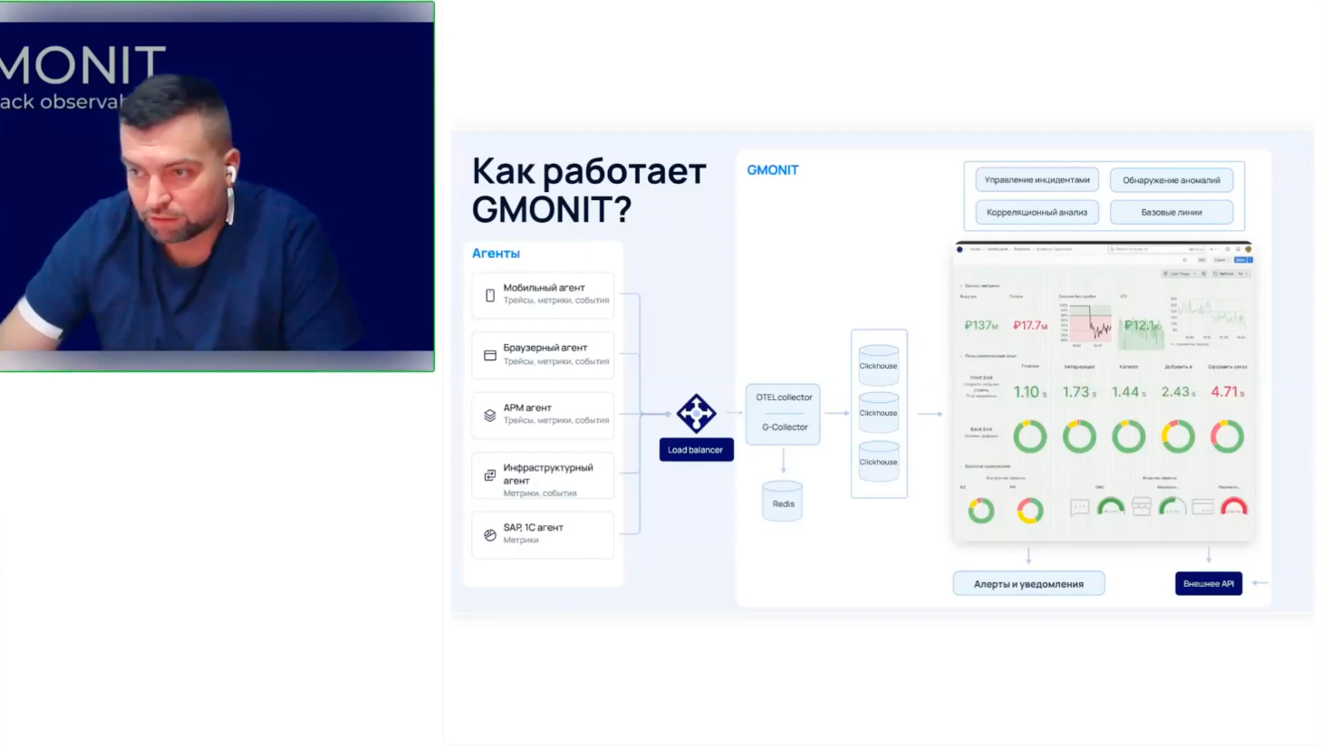 Особое внимание эксперт уделил архитектуре observability платформы и показал, как GMONIT собирает данные через мобильные, браузерные, APM, инфраструктурные, SAP и 1С-агенты, выстраивая связи между событиями. Логическим развитием этого подхода стала разработка Карточки инцидента GMONIT – нового функционала, который собирает всю телеметрию в одном интерфейсе и превращает хаотичный поток данных в структурированный контекст.