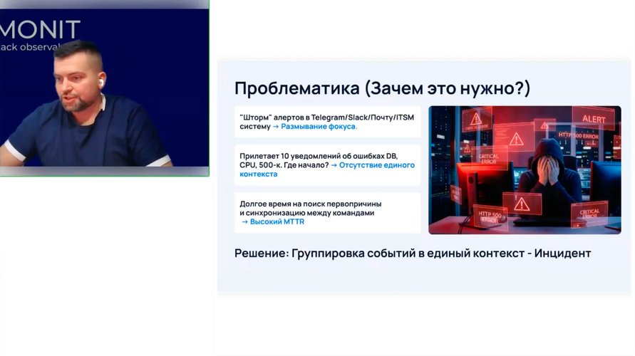 Спикер пояснил, что системы генерируют десятки уведомлений в Telegram, Slack, почту или ITSM-систему, и команды часто теряются в потоке сигналов. Приходит множество уведомлений об ошибках баз данных, CPU или HTTP 500, невозможно понять, где начало проблемы, отсутствует единый контекст, а поиск первопричины сбоя затягивается, что ведет к высокому MTTR. В продолжение темы Антон разобрал «анатомию» инцидента и логику его жизненного цикла.