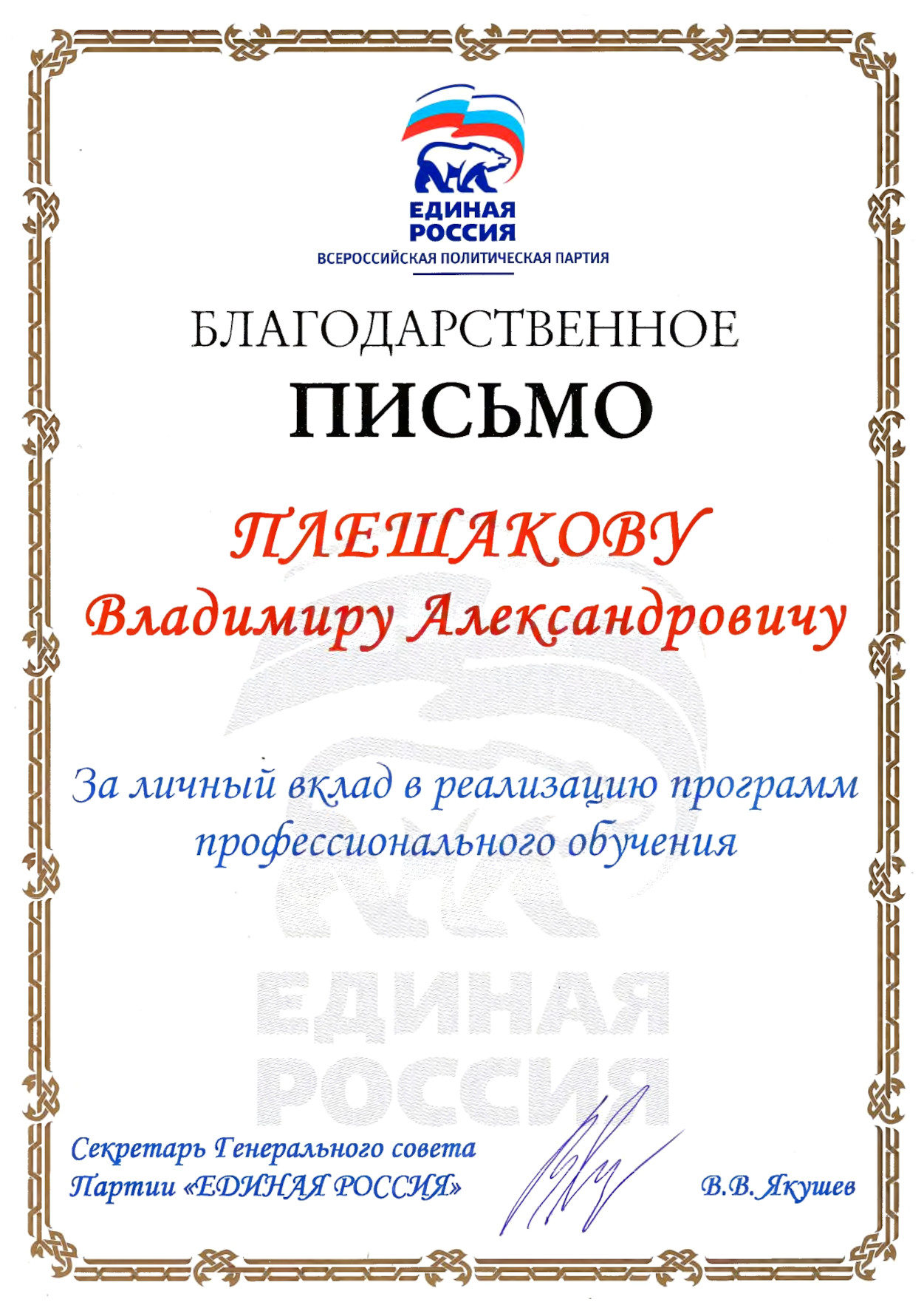 Благодарственным письмом за подписью Секретаря Генерального совета партии «Единая Россия», первого заместителя Председателя Совета Федерации Федерального Собрания Российской Федерации Владимир Якушева за личный вклад в реализацию программ профессионального обучения бойцов РСО отмечен врио ректора Алтайского ГАУ Владимир Плешаков.