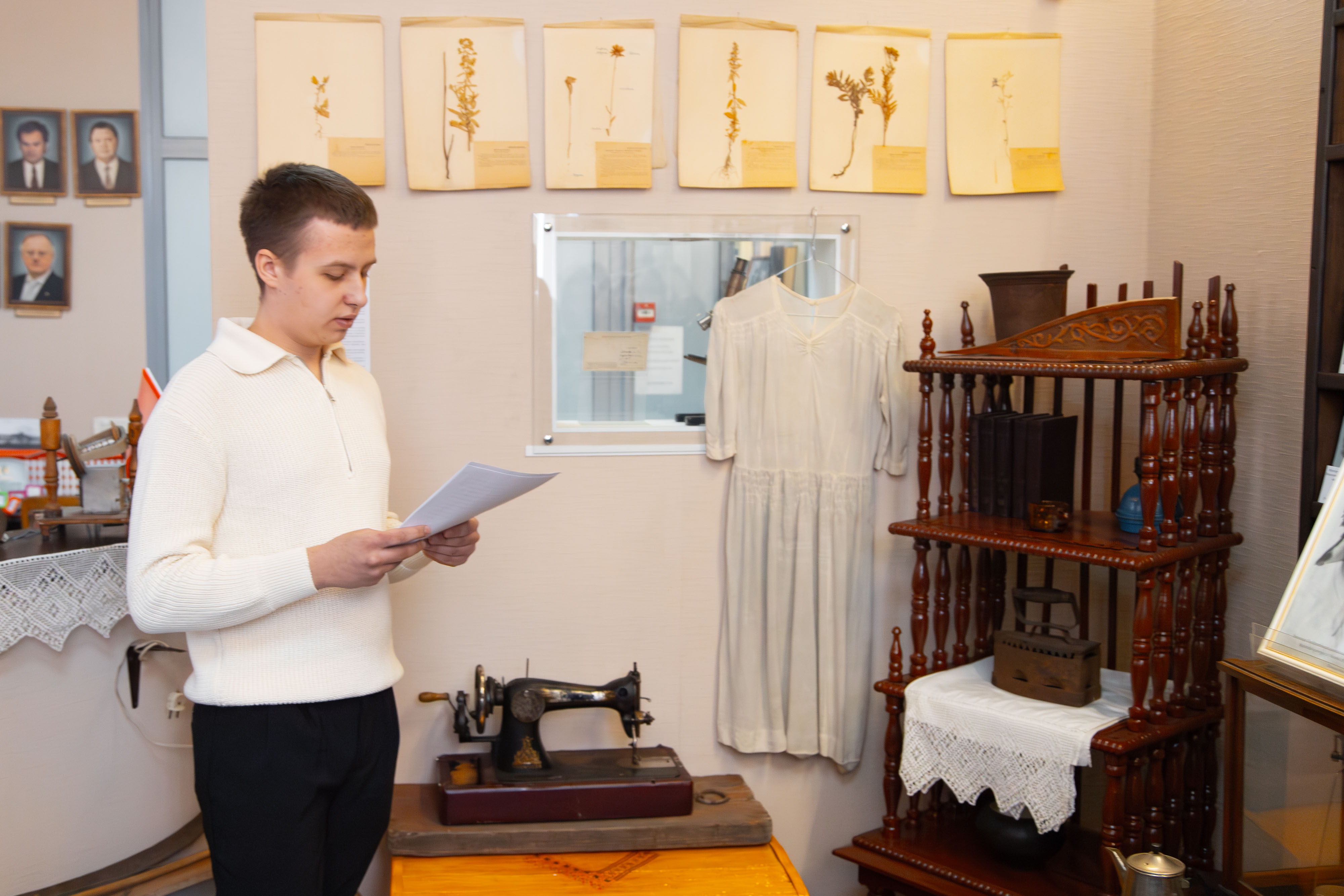 Например, выпускница первого выпуска Алтайского сельскохозяйственного института в 1946 году, а затем преподаватель АСХИ, Полина Михайловна Инютина в свое время передала в дар музею белое выпускное платье, которое было сшито ею собственноручно. Рядом стоит швейная машинка «Зингер»: на точно такой же было сшито это платье. «Машинка была легкая в эксплуатации, в том числе в её починке, что даже девушка могла легко с этим справится. Девушка занималась этим по вечерам и в этом ей помогала керосиновая лампа, которая освещала ей комнату. Только что сшитое платье, необходимо было отутюжить чугунным утюгом. Чугунный утюг нагревался с помощью углей, на печи, но случайно выпавший уголек мог не только испачкать платье, но и прожечь на нем дырки!», - рассказывает Михаил Недозрелов.