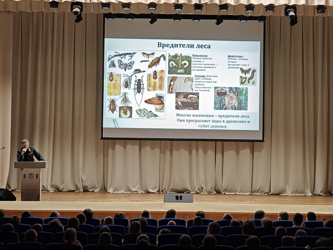 На встречу пришли ребята из 11-ти вторых классов – порядка 300 человек, поэтому мероприятие проходило в актовом зале школы. Темой лекции стала история появления растений и их трансформации в современный вид леса.