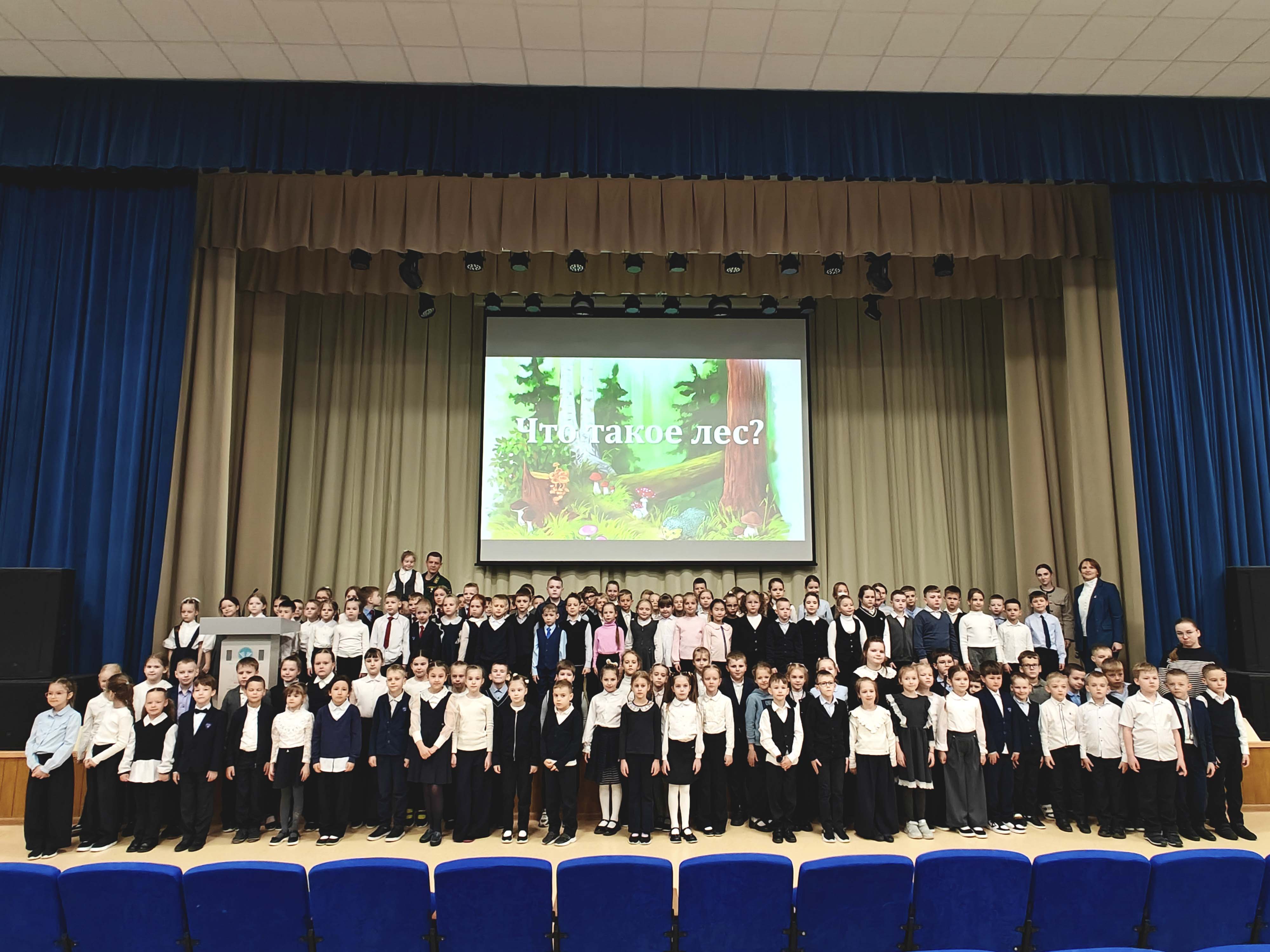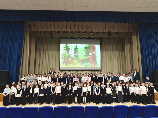 На встречу пришли ребята из тринадцати первых классов, а это 400 учеников, поэтому мероприятие проходило в актовом зале школы. Занятие проводил начальник информационно-аналитического отдела филиала Игорь Шепель. Он начал свой рассказ с истории появления растений и процессов формирования современного вида лесов. Объяснил, что является лесом и из чего он состоит.