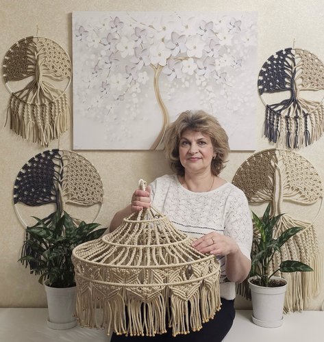 Плести макраме Лариса научилась ещё в школе. Начинала с небольших изделий – брелоков и закладок, позже переключилась на панно, кашпо, салфетки и цветочные композиции. Со своими работами рукодельница часто занимала призовые места на общегородских и областных выставках.