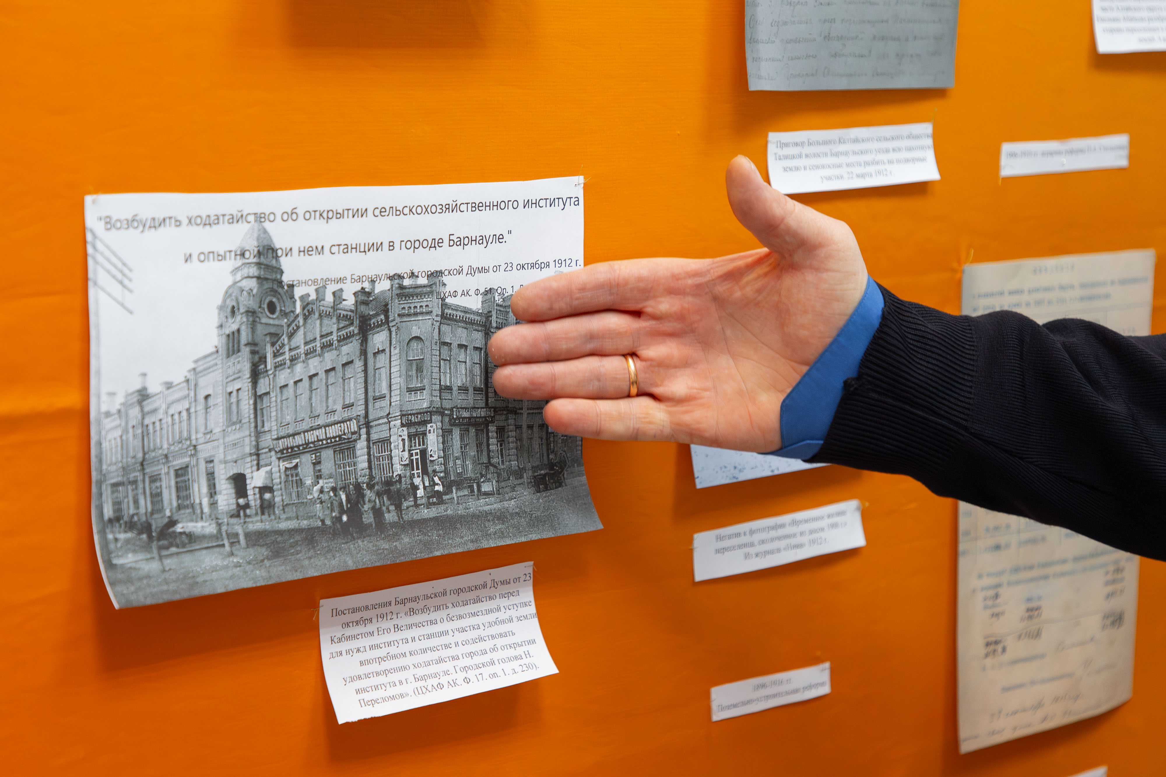 Среди экспонатов открывшейся выставки – фотокопия Постановления Барнаульской городской Думы от 23 октября 1912 г. о возбуждении ходатайства об открытии в городе сельскохозяйственного института. «Городская Дума единогласно постановила: возбудить ходатайство об открытии сельскохозяйственного института и опытной при нем станции в городе Барнауле. Возбудить ходатайство перед Кабинетом Его Величества о безвозмездной уступке для нужд института и станции участка удобной земли в потребном количестве и содействовать удовлетворению ходатайства города об открытии института в г. Барнауле. Просить Начальника Алтайского округа Василия Прокопьевича Михайлова не отказаться принять на себя совместно с городским головой представительство от города в Петербурге по вопросу об учреждении сельскохозяйственного института. Городской голова [Н. Переломов]» (ЦХАФ АК, Ф. 17, on. 1, д. 230, л. 3-5).