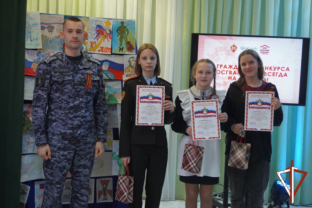 На конкурс поступило более 50 творческих работ от учащихся подшефных ведомству образовательных учреждений и юнармейцев. Церемония награждения состоялась в Курганском доме молодежи. Сертификаты участника и подарки получили юные художники из школ №5, 11, 30, 40, 42, 43, 75 и православной гимназии имени Александра Невского. Победителям вручили благодарственные письма и памятные подарки.